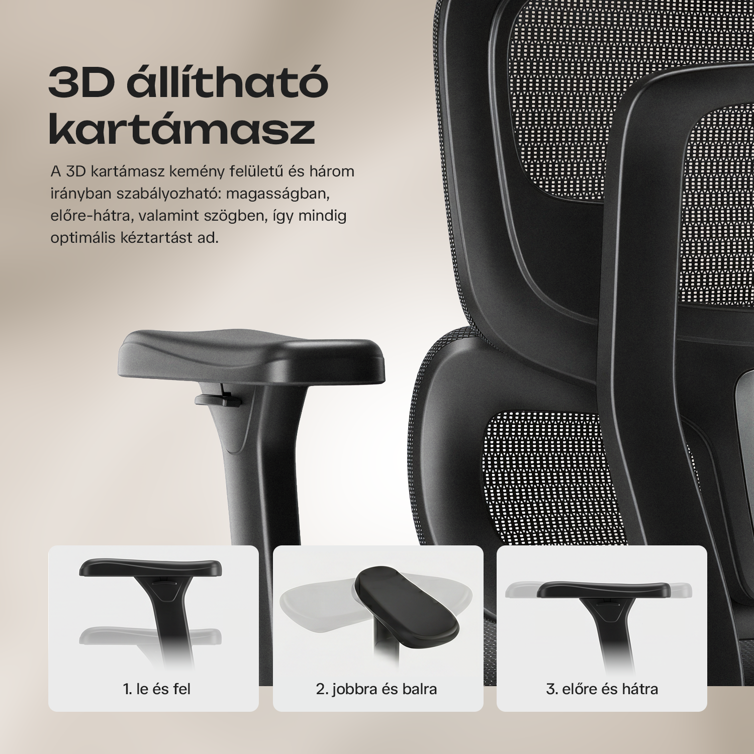 Špeciálnou vlastnosťou stoličky je nastaviteľná hĺbka sedadla, ktorá zvyšuje ergonomický komfort. 3D lakťové opierky s tvrdým povrchom je možné nastaviť v troch smeroch: výškovo, dopredu-dozadu a pod uhlom, čím zabezpečujú optimálnu polohu rúk počas práce.
