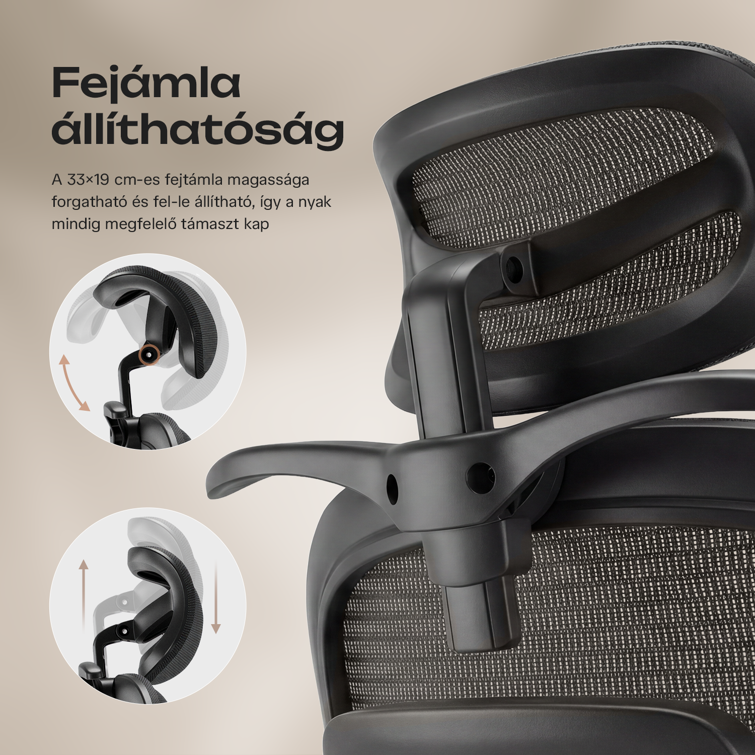 Opierka hlavy s rozmermi 33 × 19 cm má nastaviteľnú výšku, takže krk má vždy správnu oporu. Okrem toho je možné jednoducho regulovať aj výšku operadla, aby sa presne prispôsobilo výške postavy.